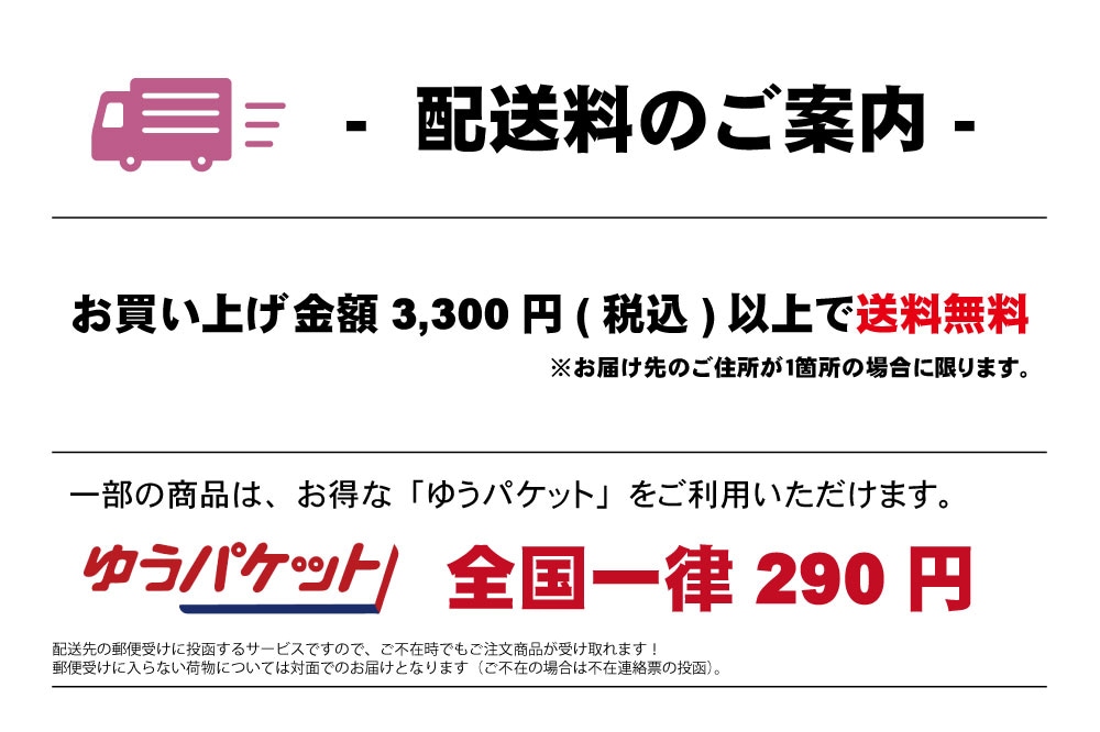 ご注文いただいた商品は、**原則として「ゆうパケット」**にて発送いたします。